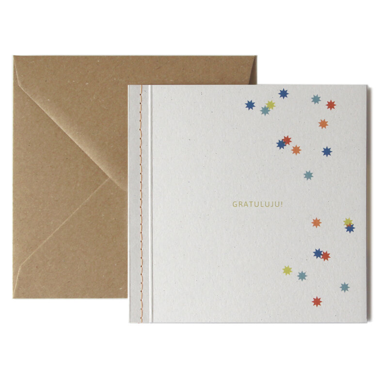 Přání z recyklovaného papíru, které se hodí k jakékoliv radostné udalosti. Uvnitř je prázdné, s decentním oranžovým šitím u hřbetu, doplněné recyklovanou obálkou. Navrženo a vytištěno v České republice.