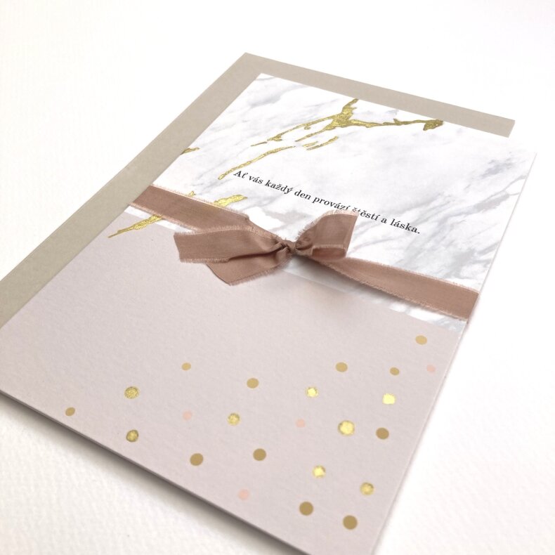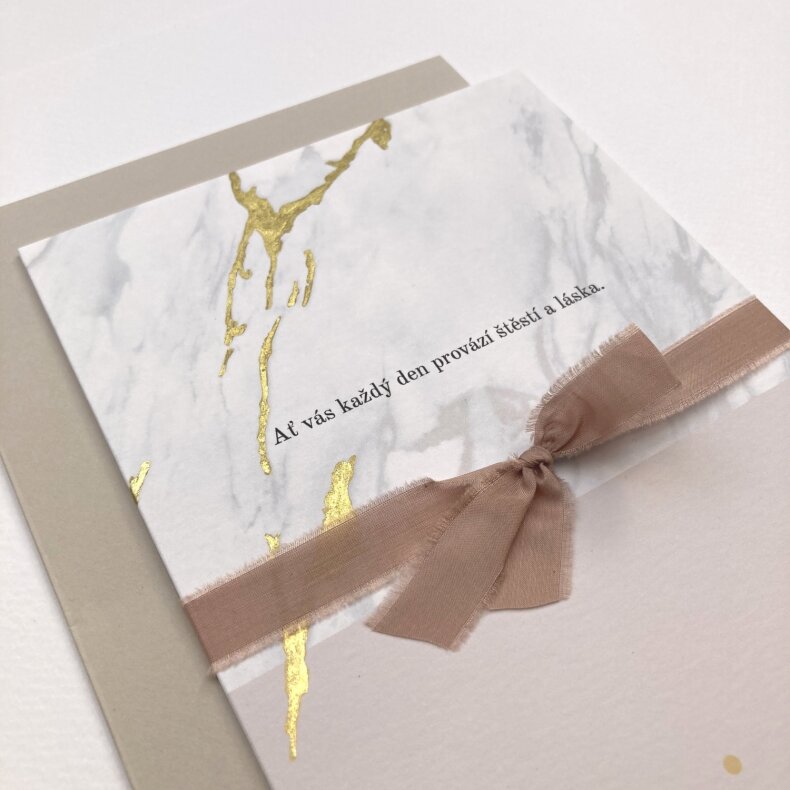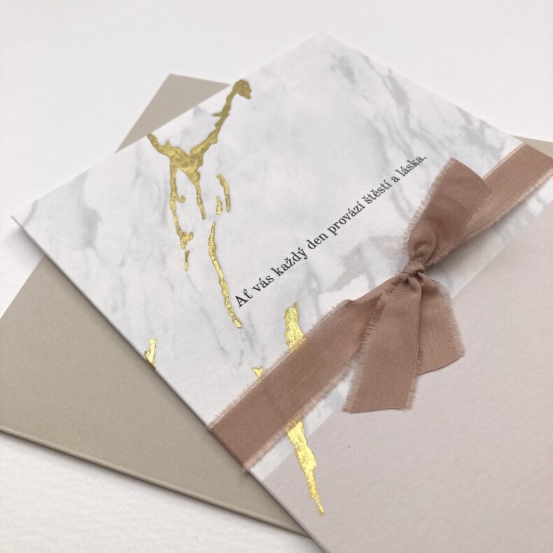 - Zdobení zlatým inkoustem a hedvábmou stuhou