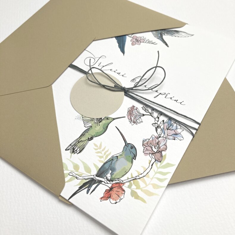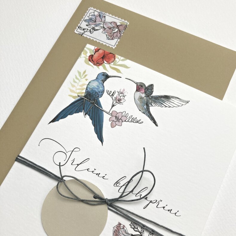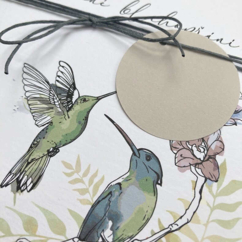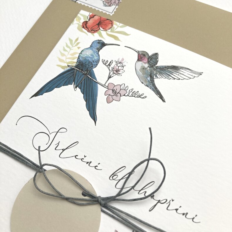 Přání s motivem kolibříků. Dvojitá karta s rovnými okraji s textem “Srdečné blahopřání”, převázená provázkem se štítkem. Doplněno o obálku s ozdobnou známkou.
