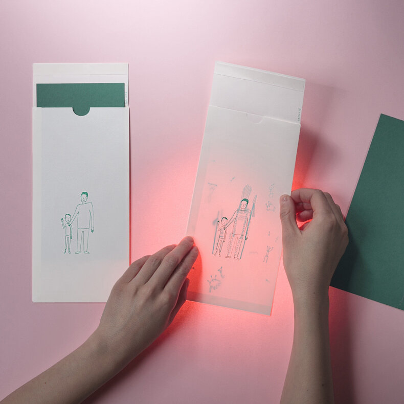 Obálka ukrývá dvě vrstvy potisku, které se při prosvícení spojí v jednu ilustraci a odhalí tak na první pohled neviděný zázrak.