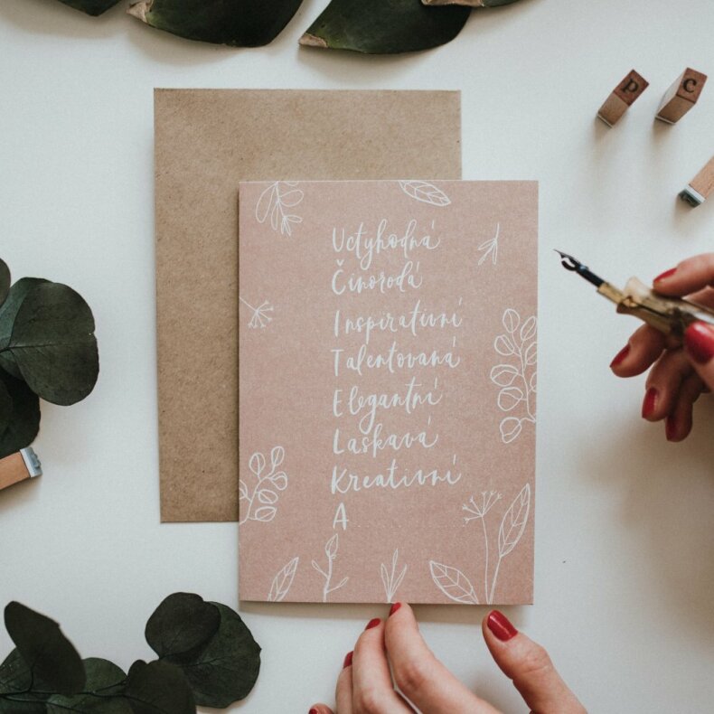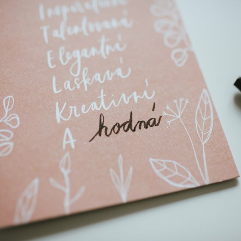 Přání ilustrovala česká výtvarnice Bára z Nikolajky. Ilustrace drobných květin společně s pozitivními vlastnostmi učitele jistě obdarovaného potěší. Přáním mu tak dáte najevo, že si jeho práce vážíte. Poslední písmeno není doplněné a je určené k vepsaní vlastnosti specifické pro vaší paní učitelku.