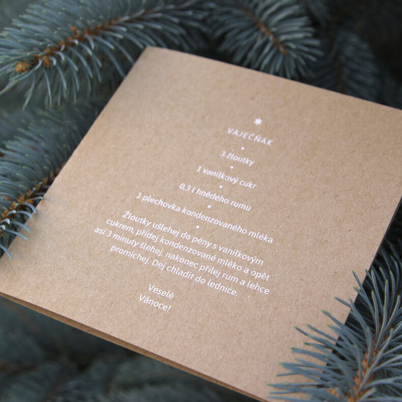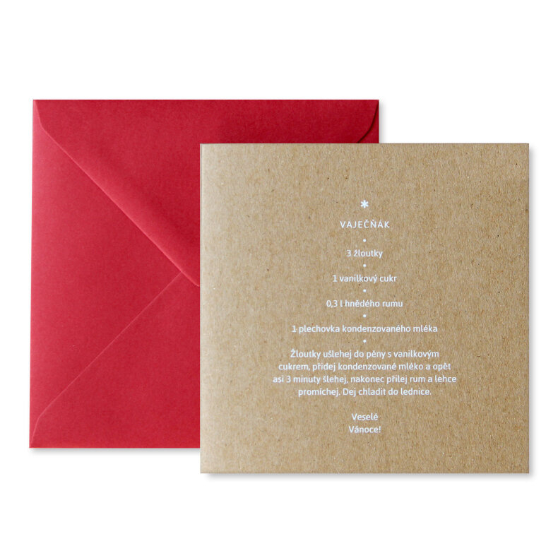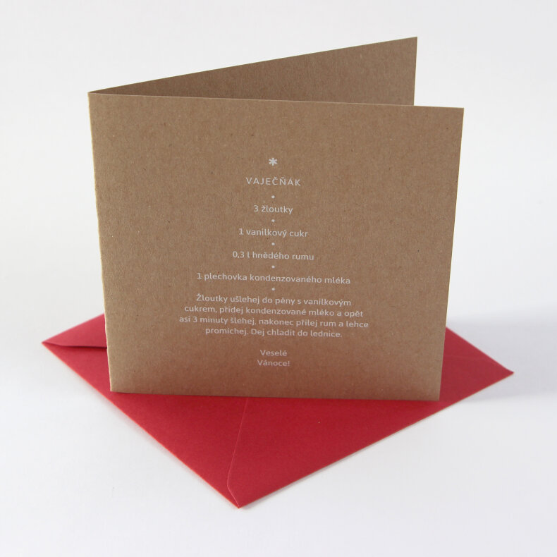 Přání z recyklovaného papíru s decentním šitím u hřbetu. Uvnitř je prázdné, doplněné recyklovanou obálkou. Navrženo a vytištěno v České republice.