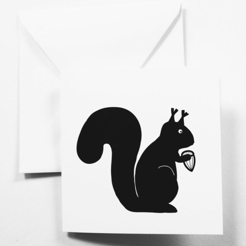 Černobílé přání s motivem veverky.