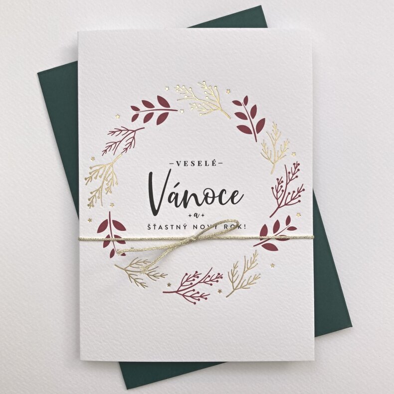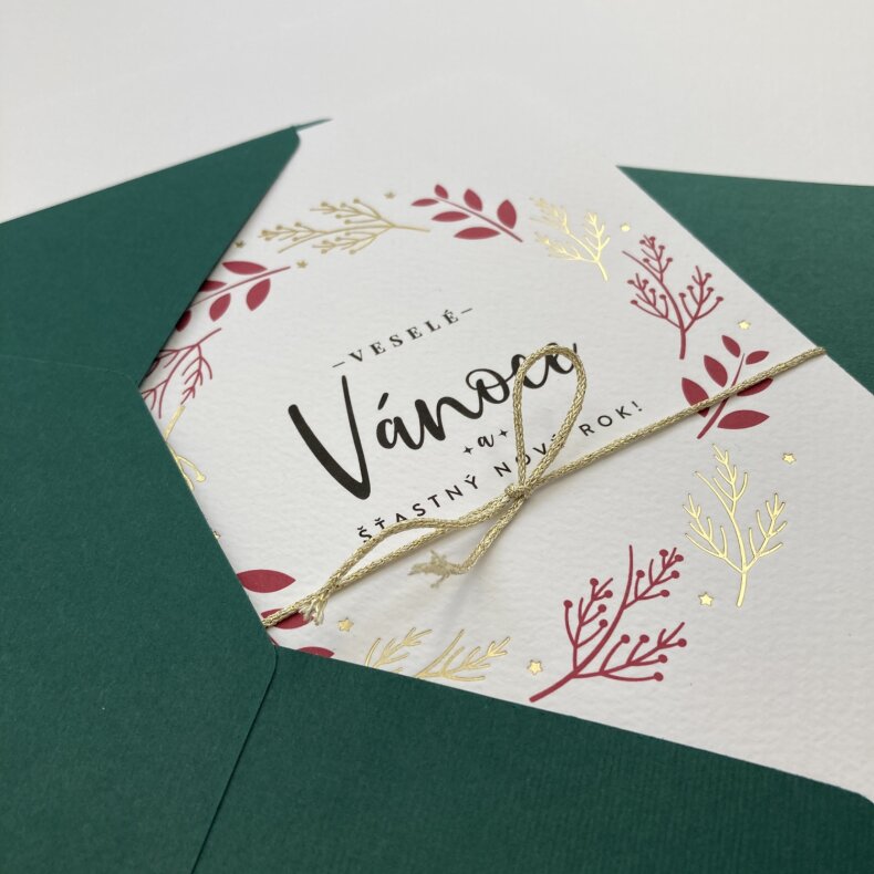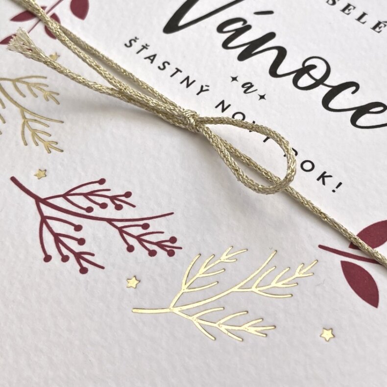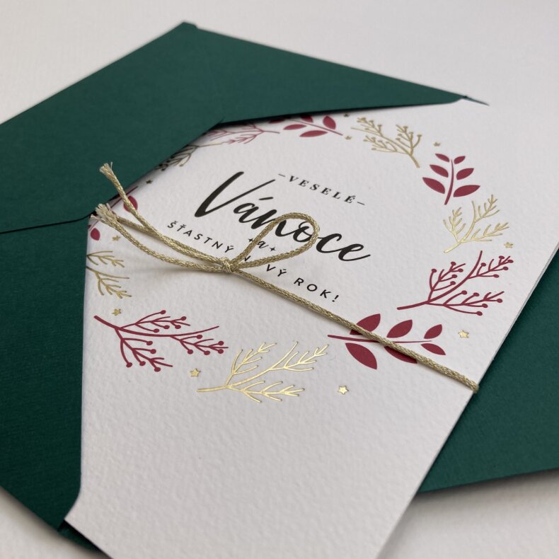 Přání s motivem zlatých a červených větviček. Dvojitá karta s rovnými okraji s textem “Veselé Vánoce a šťastný Nový rok!”, převazaná zlatým provázkem. Doplněno o zelenou obálku.
