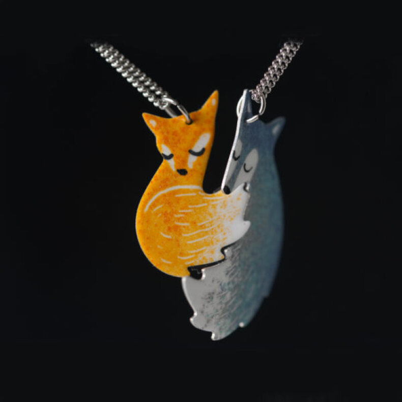 Přívěšek je tvořen dvěma liškama na řetízku (je možné je udělat i na posuvném tenkém černém provázku), lišky do sebe zapadají, je to řetízek pro přátelé, nebo pro pár. Malujeme je ručně, mohou se malinko lišit. Lišky i řetízek jsou z nerezu. Oranžová liška je velká 2,5cm, šedá 3,5cm.
