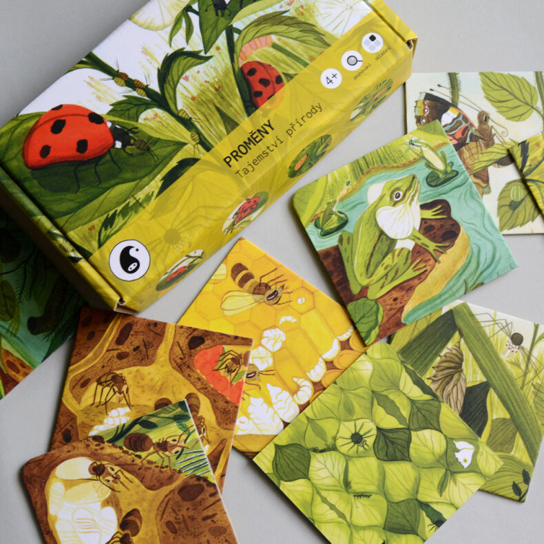 V krabičce najdeš tato zvířata: slunéčko sedmitečné, čolek velký, mravenec lesní, včela medonosná, babočka admirál a skokan zelený. Ilustrace: Aneta F. Holasová