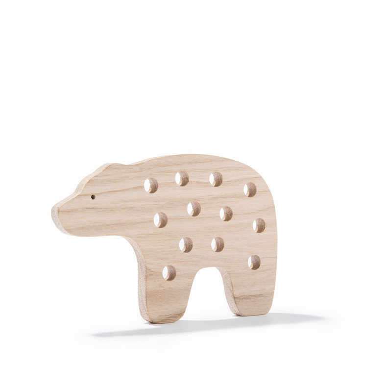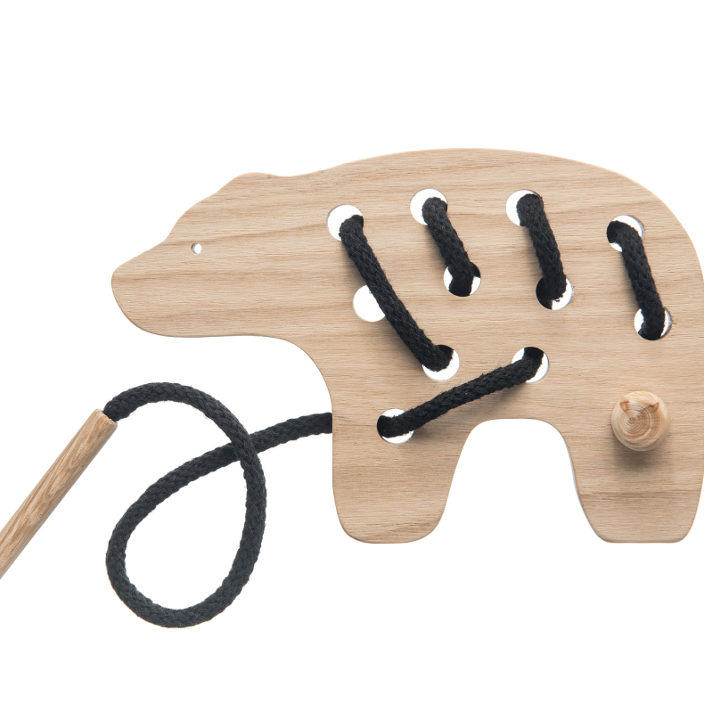 Dřevěná motorická hračka pro rozvoj dětské zručnosti. Hračka se skládá z dřevěného prvku ve tvaru zvířete a textilní šňůry zakončené z obou stran dřevěným špuntem a dřevěným kolíkem.