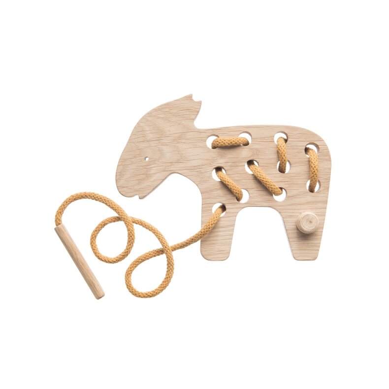 Dřevěná motorická hračka pro rozvoj dětské zručnosti. Hračka se skládá z dřevěného prvku ve tvaru zvířete a textilní šňůry zakončené z obou stran dřevěným špuntem a dřevěným kolíkem.