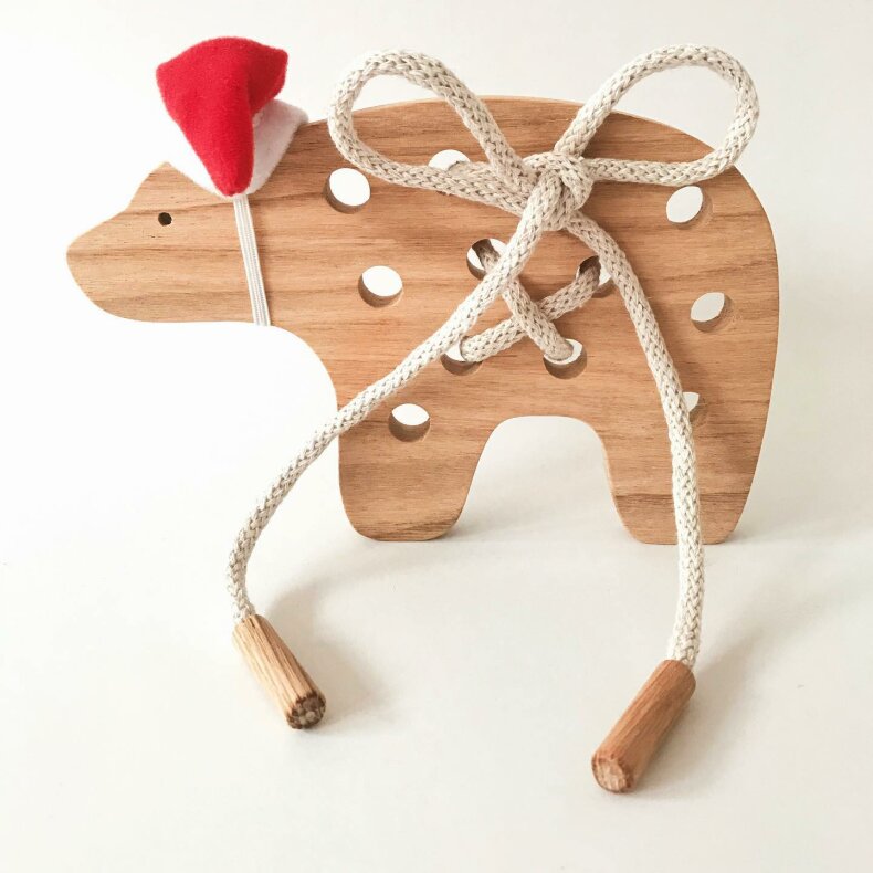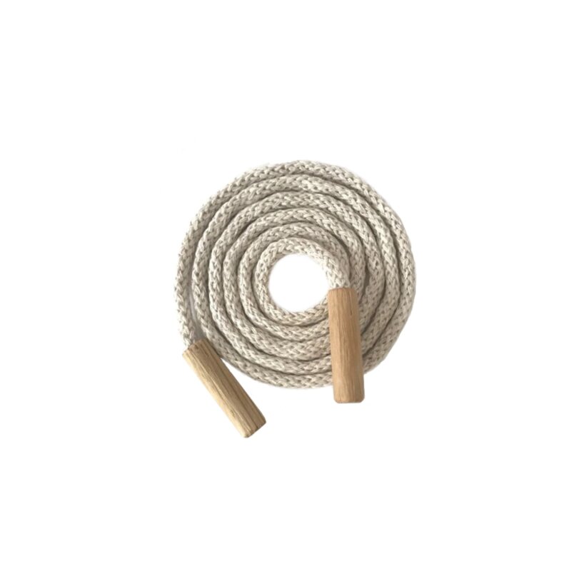 Tkanička k provlékací hračce k procvičování zavazování. Textilní šňůra s dřevěnými kolíčky na koncích.