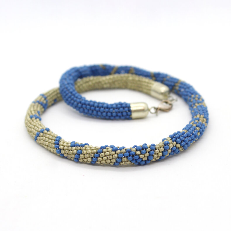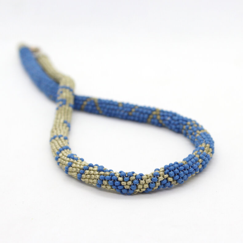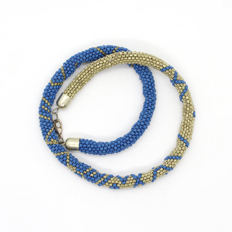 Náhrdelník je ručně šitý z rokajlových korálků. Délka šité části je 40 cm. Při zapnutí leží volně ve spodní části krku zhruba v úrovni krční jamky. Průměr šité šňůry je cca 1 cm.