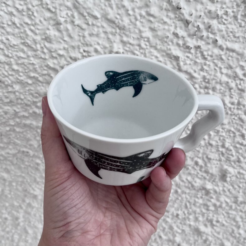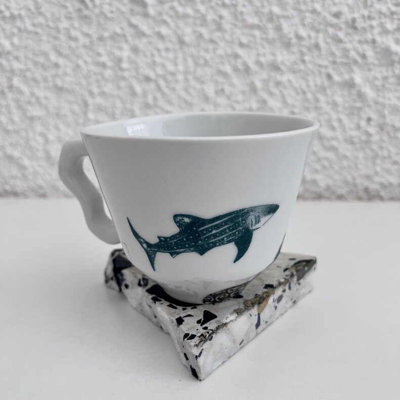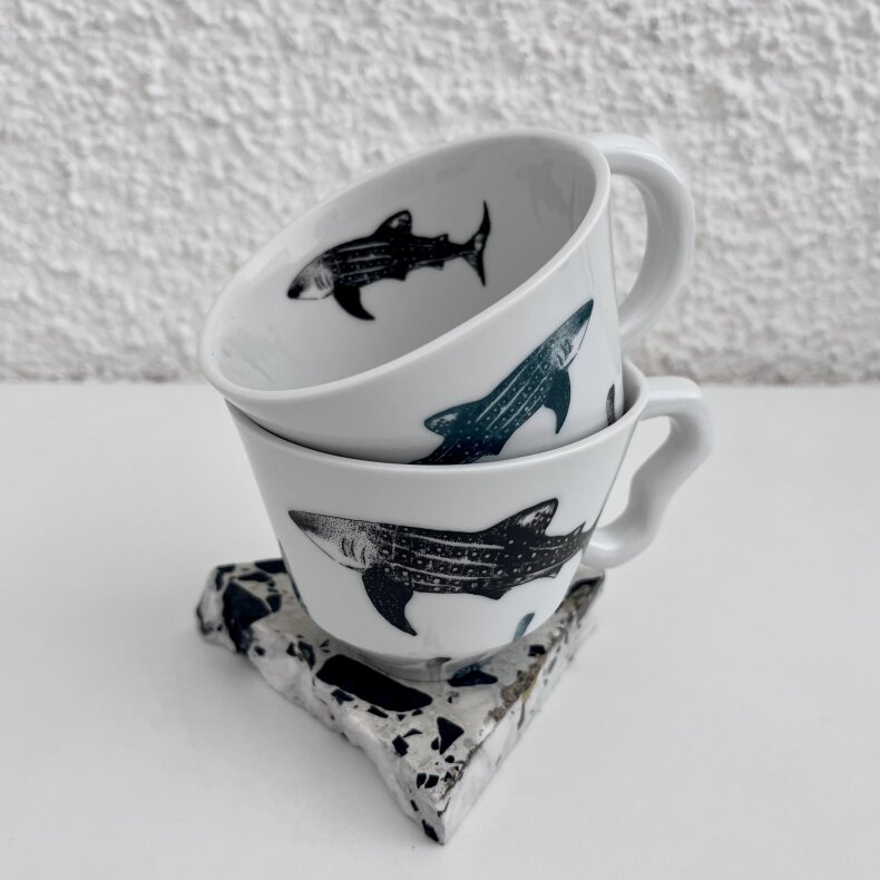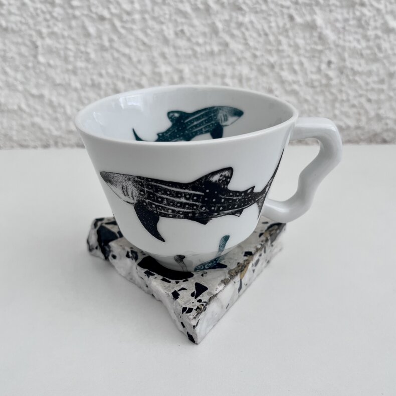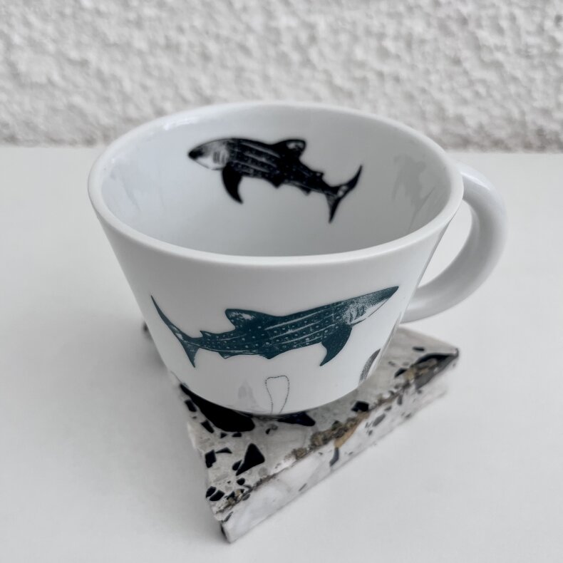 Ponořte se do voňavého nápoje jako ryby do vody. Porcelánový šálek s motivem žraloků jako stvoření na čaj nebo kávu.