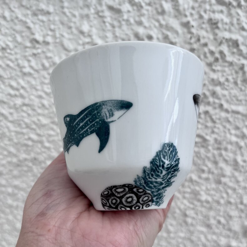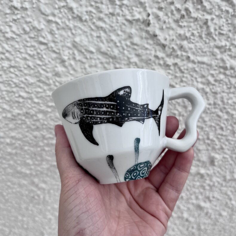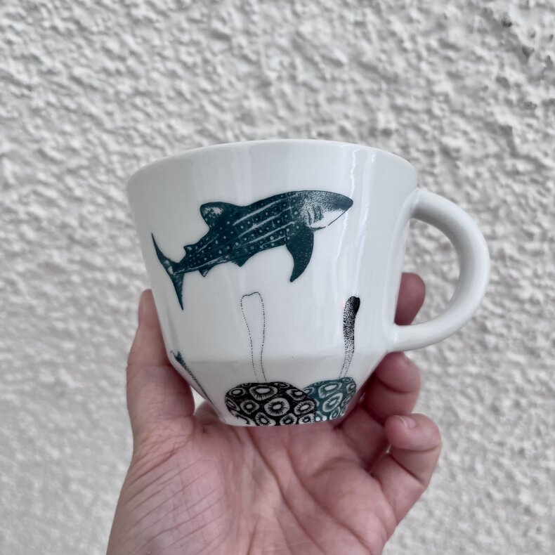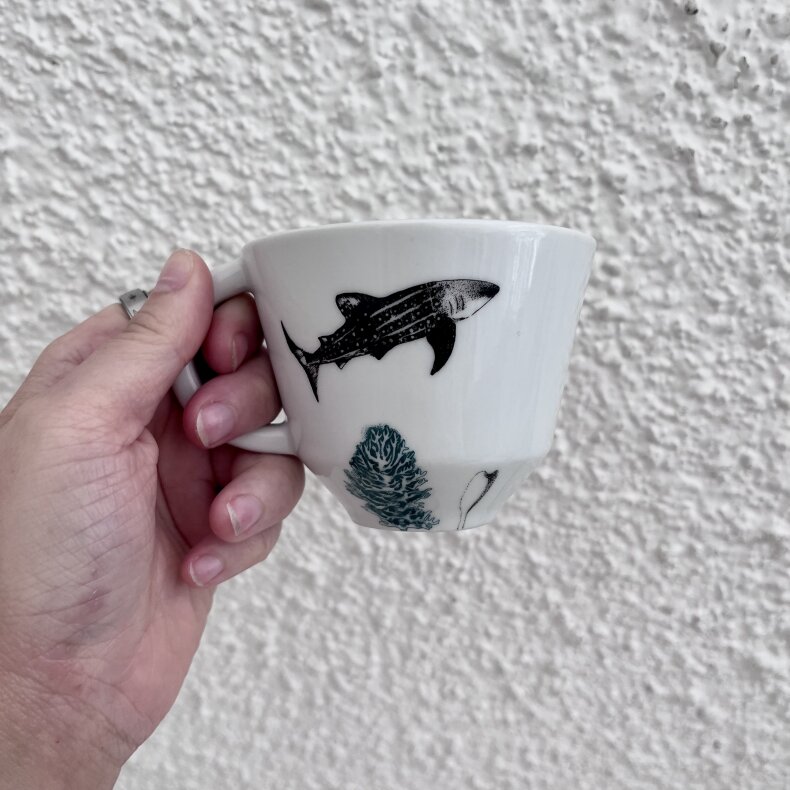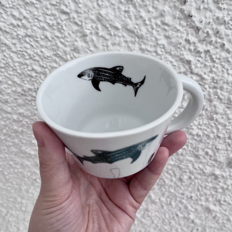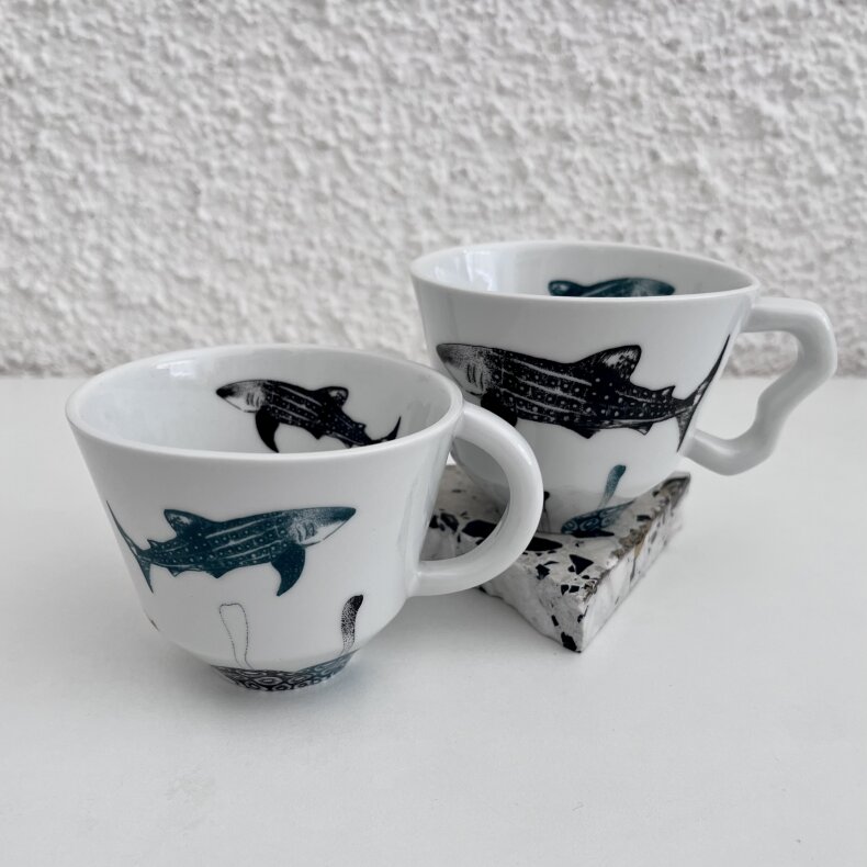 Ponořte se do voňavého nápoje jako ryby do vody. Porcelánový šálek s motivem žraloků jako stvoření na čaj nebo kávu.