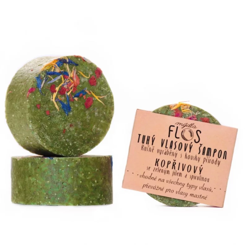 Ručně vyráběný kopřivový šampík se zeleným jílem a spirulinou.