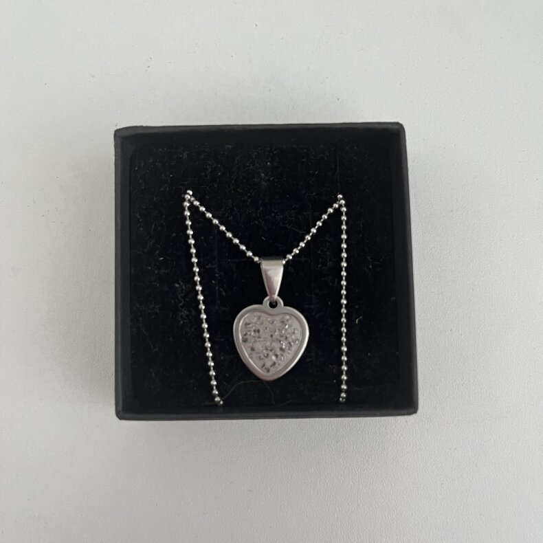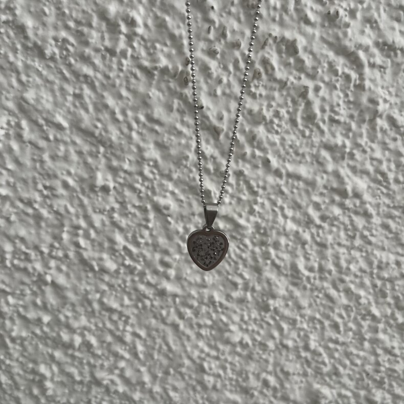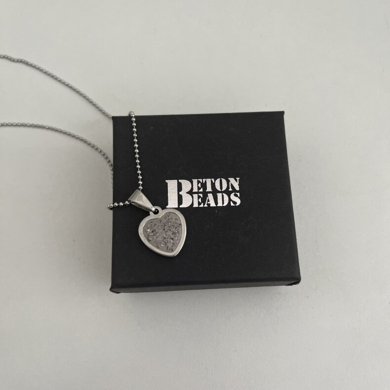 Náhrdelník je kombinací šperkařského betonu zasazeného v základu a řetízku z oceli 304, stříbrné provedení. Přívěšek má průměr 15 mm.