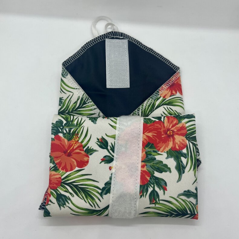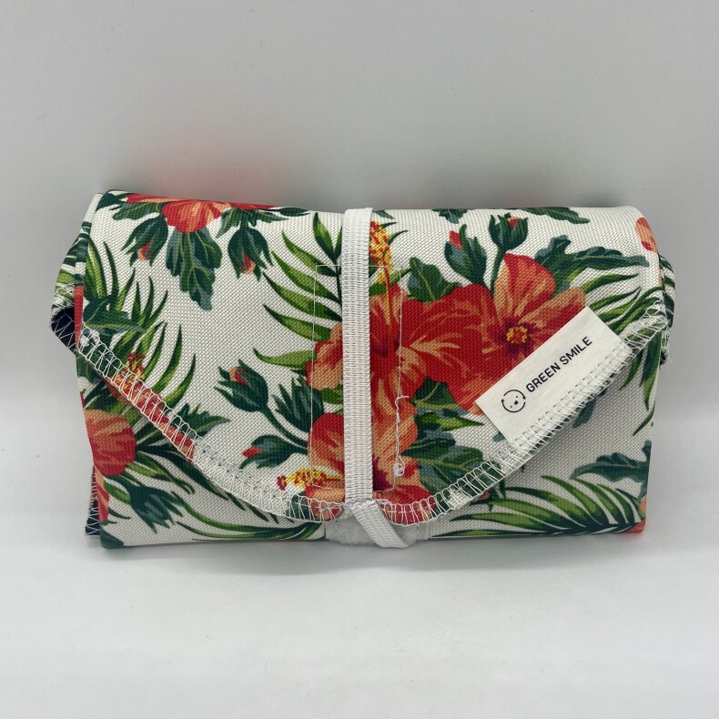 Balení svačiny do ubrousku je velmi jednoduché. Stačí překlopit boční strany k sobě, pak spojit vrchní stranu se spodní pomocí suchého zipu a nakonec. Pro maximální zabezpečení jídla, je třeba přetáhnout gumičku přes celý ubrousek.