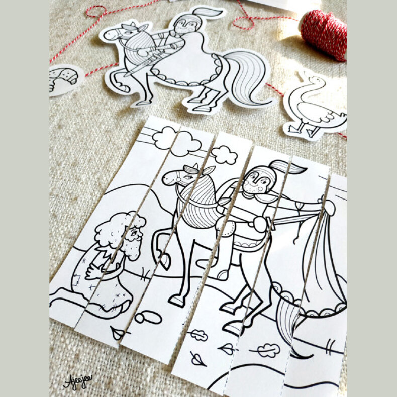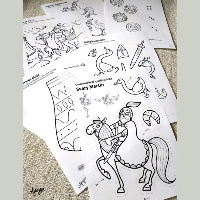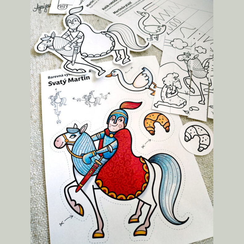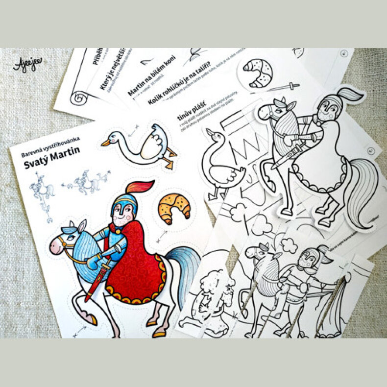 Kompletní sada černobílých aktivit na téma příběhu svatého Martina k vytisknutí a barevná vystřihovánka k tomu.