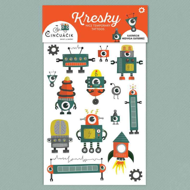 Robotické tetovačky nakreslila Hedka Gutierrez ve spolupráci s dětským knihkupectvím na kolečkách Činčuáčik. Dočasné tetovačky jsou dermatologicky testované a vhodné i pro děti.