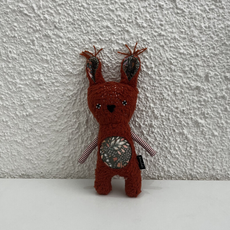 Tohle čiperné stvoření je ušité z bavlněného rezavého fleecu, který je hebký na dotek. Tlapky má tištěného plátna a na bříšku a uších má vzorovanou teplákovinu. Detaily na obličeji jsou ručně vyšívané.