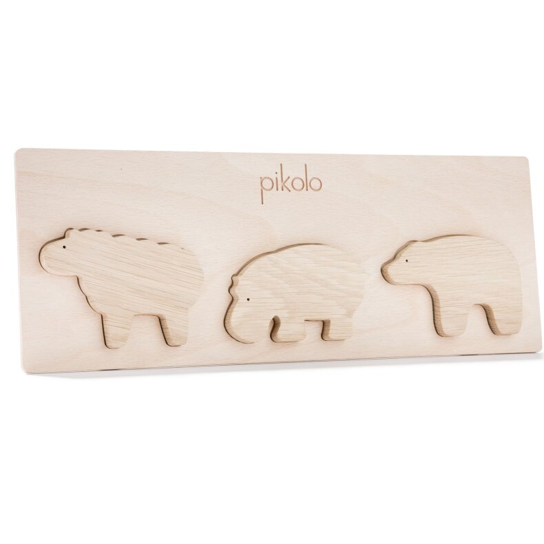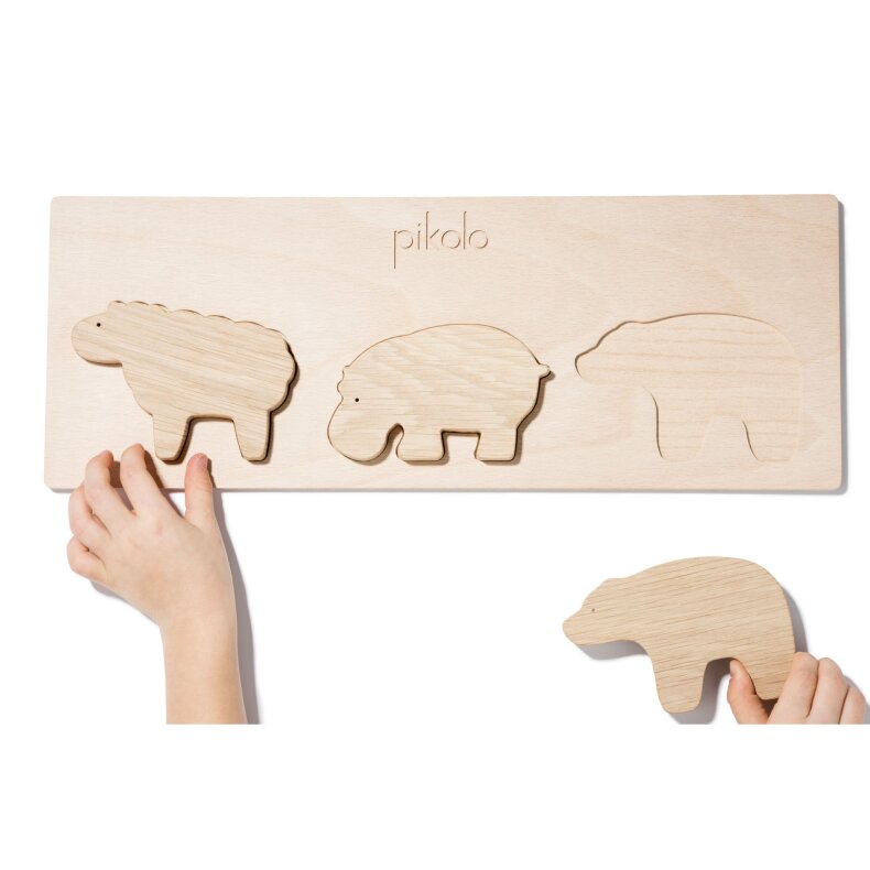 Dítě bere do ruky jednotlivé dřevěné vkládací prvky (ovečka, hroch, lední medvěd) a přiřazuje je resp. vkládá do správných obrysů lůžek v podložce. S jednotlivými vkládacími prvky si dítě může i jen volně hrát. Při práci s hračkou dítě  procvičuje jemnou motoriku prstů, rozeznávání tvarů a logické myšlení.