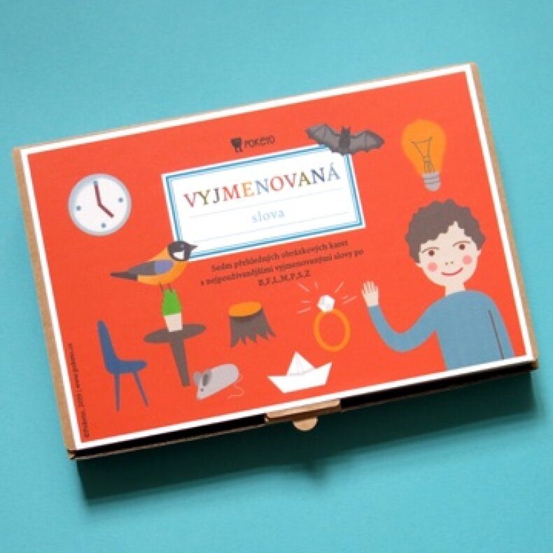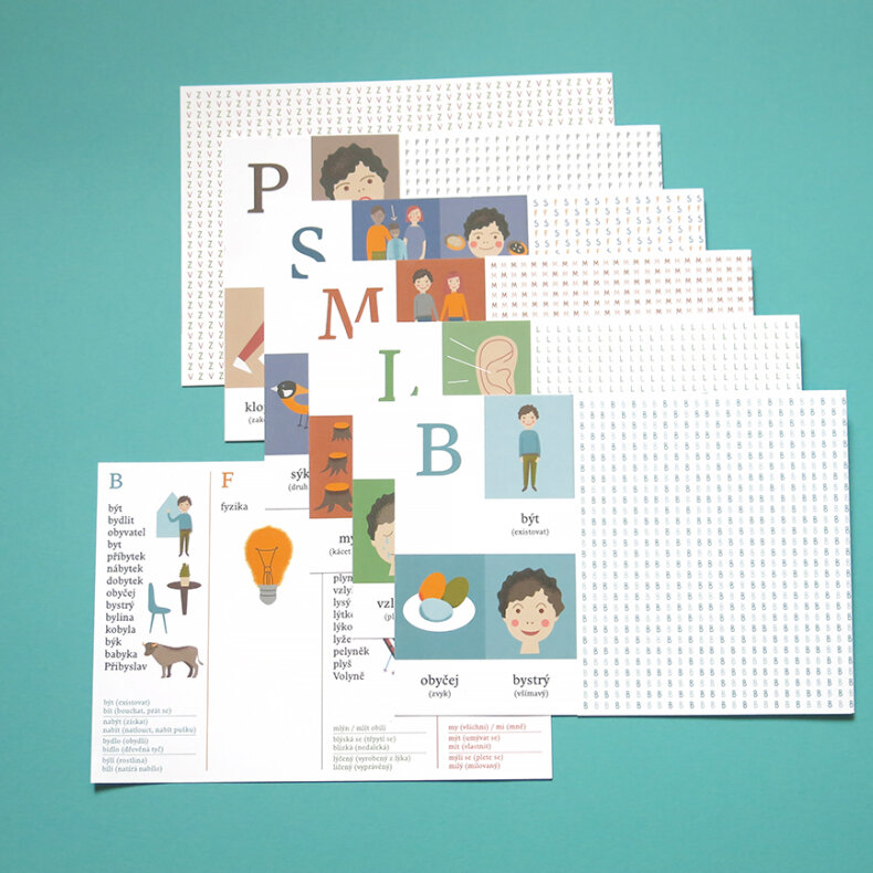 Sada obsahuje šest karet s jednotlivými vyjmenovanými slovy a obrázky, sedmá karta je přehledová se všemi slovy najednou.