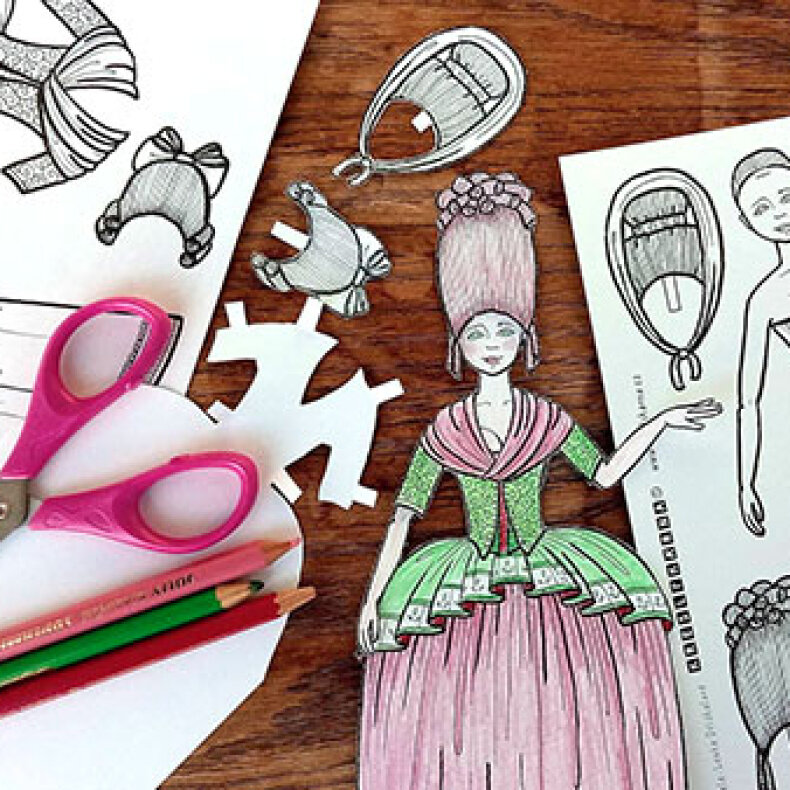 Vystřihni, vybarvi a obleč barokní komtesu. Na výběr máš dvoje krásné šaty a několik dobových paruk.