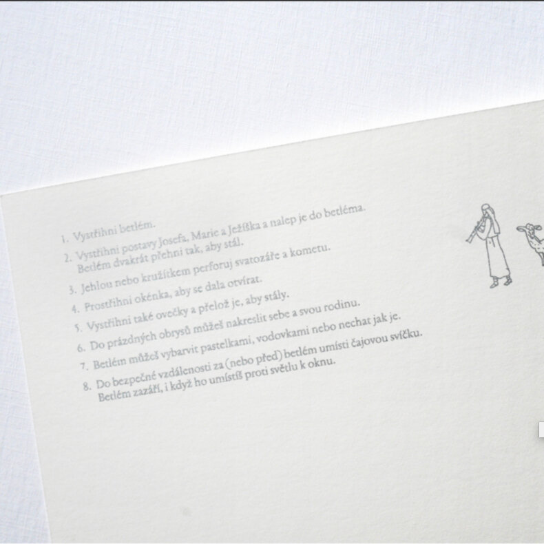 Návrh a kresba Pavlína Lörinczová, text Lucie Rohanová na motivy myšlenek P. Josefa Čermáka. Serigrafie stříbrnou barvou René Řebec.