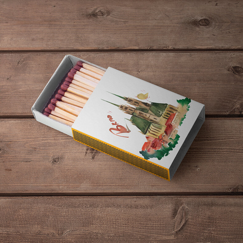 neotřelá krabička zápalek s ilustrací Olgy Yakubovské