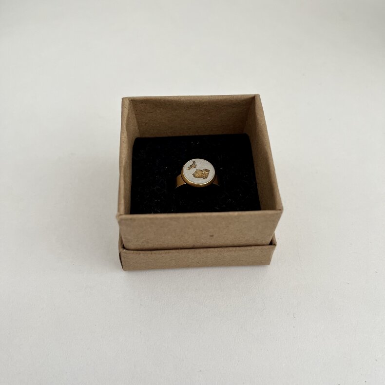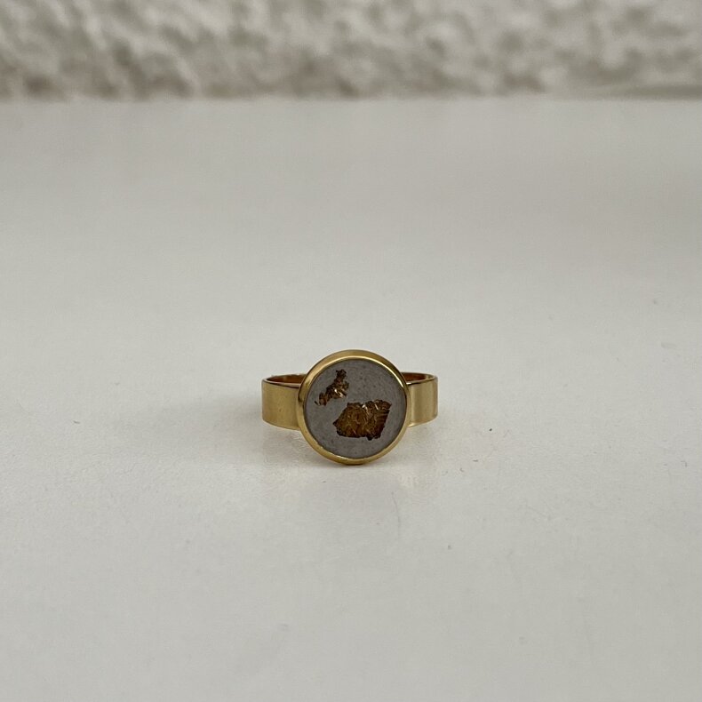 Prsten je kombinací barevného betonu zasazeného v základu z oceli 304kvalitní zlatou povrchovou úpravou.